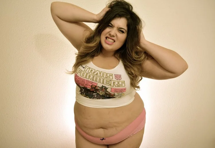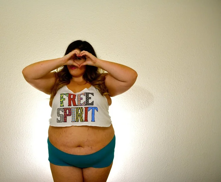 C'est une chose triste à dire, mais je pense que si j'étais plus mince les gens ne feraient pas tant cas de mes vergetures. Il y a cette idée fausse que les femmes grosses ont des vergetures parce que nous mangeons trop, nous restons assises toute la journée et nous sommes le type même d'un des péchés mortels, la gloutonnerie. Et si certaines d'entre nous le sont, qui se soucie? Mais pourquoi y a-t-il des gens, même nous-mêmes, si pressées pour juger? Nous devons tous surmonter le stigmate placé sur les vergetures et chaque autre type de cicatrice. Notre peau est une toile. Chaque toile est différente et couverte de choses différentes. C'est notre individualité, notre caractère unique, notre beauté.