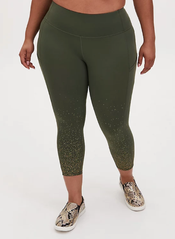 The first leggings we have is the “Black Wicking Active Legging With Pockets” from Torrid leggings. The reason these are on the list is because they feature that opaque fabric we were talking about, Nylon, as well as an amazing size range from a medium or size 10 to a 6x or size 30. They have 220 reviews on their website averaging 4.5 stars as well where customers say they’re loving the pockets that will fit a phone and that they don’t roll down. They come in three ankle lengths, full size, cropped and capri for whatever length you’re in need of and if you want some color, they have an olive-green option with gold speckles around the ankles.