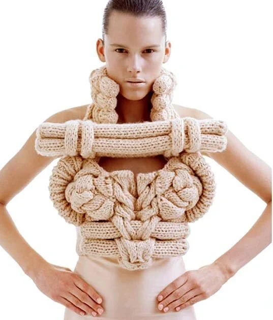 Sandra would describe herself as more of a sculptor than a tailor, making three-dimensional pieces designed both to fit the body and hold their shapes away from the body, creating a sort of body armor with a distinctly structural shape that also molds to the body. Her one-of-a-kind, three-dimensional knitwear focus on sculptural forms that borrow from both avant-garde and conceptual art. Sandra clearly has a passion for quality and craft, a close attention to detail, and a unique desire to discover unconventional materials and techniques.