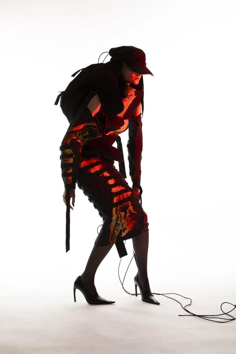 L'héritage des grands couturiers tels que Christian Dior et Coco Chanel inspire toujours les créateurs avec leurs silhouettes emblématiques. Cette époque de la mode est typiquement synonyme de traditionalisme et de l'idée d'une femme “classique” qui respire l'élégance. J'ai le sentiment que Monsieur Dior ne s'attendait pas à ce que des créateurs comme Benji Nijenhaus réinterprètent son œuvre. Récemment diplômé de l'université des arts ArtEZ aux Pays-Bas, sa collection de fin d'études, intitulée “Broken World and the Beast”, mélangeait des formes classiques comme le New Look et le tailleur Chanel avec des imprimés intenses d'éruptions volcaniques et de cuir de vachette de seconde main. Il a encore contrasté ces éléments en ajoutant des gilets tactiques et des tissus en nylon. La collection imagine l'homme revenu à un état animal, à nouveau pleinement intégré au monde naturel. L'attitude du maquillage inspiré de KISS et des vêtements à pointes est juxtaposée au tailleur, ce qui apporte un équilibre bienvenu à l'ensemble. La capacité de Nijenhuis à mélanger l'esthétique “camp” avec une perspective classique crée ces personnages singuliers qui mettent parfaitement en valeur sa personnalité dangereusement imaginative.