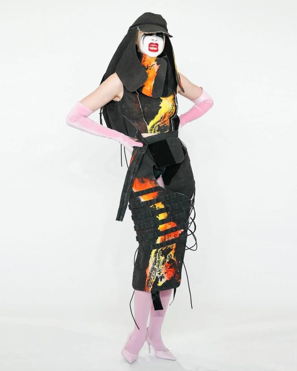 The legacies of great couturiers such as Christian Dior and Coco Chanel still inspire designers with their iconic silhouettes. This era of fashion typically denotes traditionalism and the idea of a “classic” woman oozing elegance. I have a feeling that Monsieur Dior did not anticipate designers like Benji Nijenhaus reinterpreting his work. A recent graduate of Artez University of the Arts in the Netherlands, his graduate collection, titled “Broken World and the Beast,” mixed classic shapes like the New Look and Chanel suit with intense prints of volcanic eruptions and secondhand cowhide leather. He further contrasted these elements by adding tactical vests and nylon fabrics. The collection envisions humans reverted to an animalistic state, once again fully integrated with the natural world. The attitude of the KISS inspired makeup and spiked garments are juxtaposed with tailoring, providing a welcome balance to the ensemble. Nijenhuis’ ability to blend camp aesthetics with a classic perspective creates these singular characters that perfectly flaunt his dangerously imaginative personality.