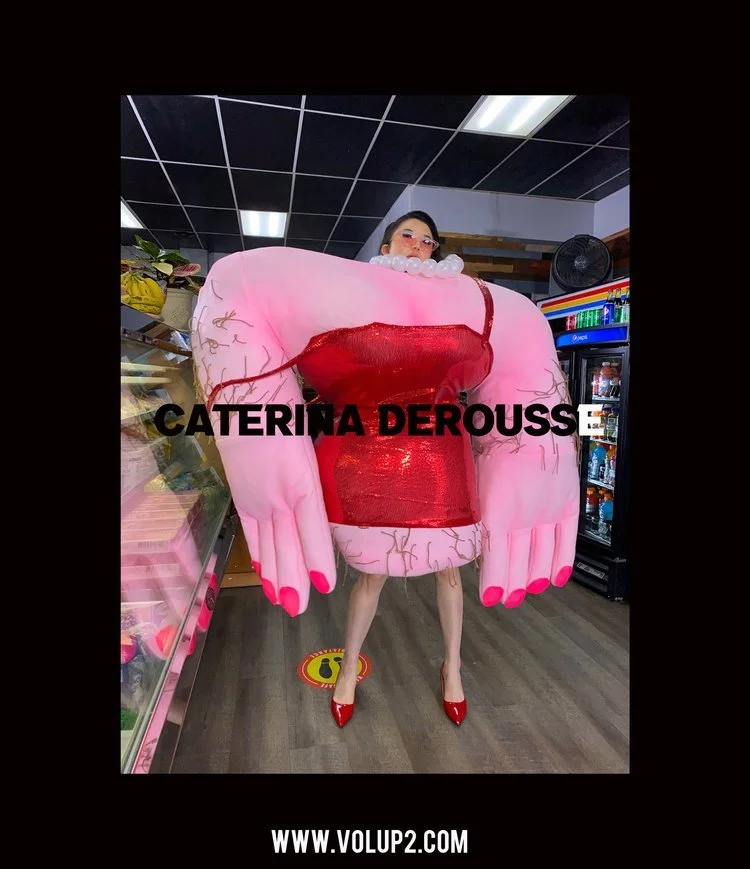 Distorted proportions, colossal accessories, and cartoonish silhouettes are only a few ways to describe Caterina DeRousse’s work. This Chicago based designer uses volume and shape to bring the viewer’s attention to the relationship between the body and the wearer. Through their work they want to answer this one question: What becomes of one’s identity when the body is distorted beyond limits? In DeRousse’s senior collection, “No Pictures!!!!!!!!!” they use boxy silhouettes around the shoulder, arms, and hands to completely overwrite the body. As their garments’ proportions continue to be manipulated, their works explore how our identity changes when we are already in a spectacle of an outfit. It will be exciting to see what DeRousse does next as they continue to grow in their career.