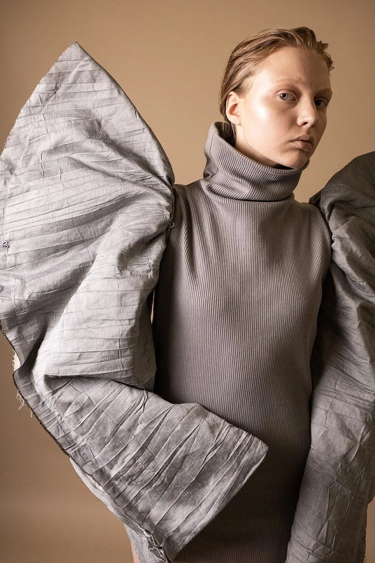 I invent transformable garments as a solution for conscious consumption. While physical shopping is limited to a couple of items, the wearer is provided with an unlimited utilitarian potential. The intention that stands out in all DZHUS designs is that it's no longer necessary to sacrifice everyday styling experiments for the sake of sustainable living.