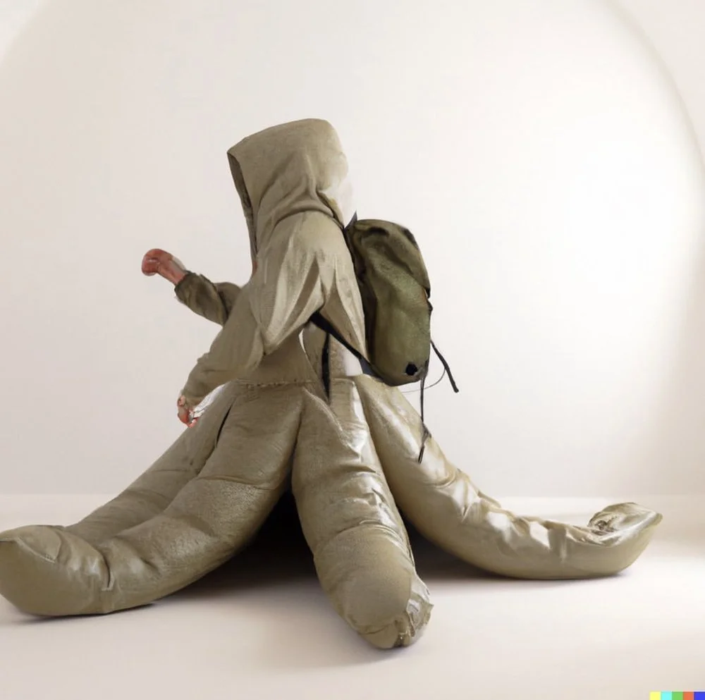 Mistiaen engineered, for example, a camping tent in the shape of an octopus. He posted his concept to his profile on Instagram, which reaches an audience of 82,000 followers, with the caption, “essential bioaugmentations for hiking in wet conditions.” Distracted by the outlandish length of the tent’s tentacles and the faceless camper carrying the tent, I, at first, missed the messaging embedded in Mistiaen’s design. Upon closer examination of his concept and caption, I realized that Mistiaen seems to draw on the symbolism of octopuses to push an eco-conscious message in his creation. Octopuses symbolize selflessness and regeneration. These sea creatures forgo their natural instincts, like finding food and seeking shelter from predators, to protect one another and their environment. Mistiaen captures the structure and character of an octopus in his concept. He makes his creation biodegradable so as to not harm the environment. This specific design of Mistiaen’s sparks a conversation about the current negative impact of humans on our environment through fashion. He encourages his followers to emulate octopuses–to better their environment by consuming fashion more consciously.