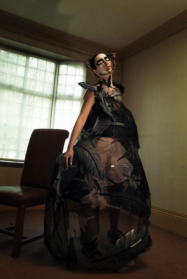 Dans un même ensemble, les créations de Zita Tianyu Tan ressemblent à des pièces extraites de la garde-robe de Christian Grey. Sa sélection de tissus transparents, de plumes, de baleines et de bas a pour effet de présenter la sexualité avec une touche de tristesse. Dans sa collection de vêtements pour femmes 2021 intitulée “Texture of Emotions”, Tan esthétise la douleur en créant des ensembles érotiques à partir de matériaux brûlés ou cassés. Elle manipule des plumes à l'aide d'un pistolet thermique, par exemple, afin d'obtenir la forme adéquate dont elle a besoin pour ses créations. Le processus de fonte et de moulage des plumes incarne la douleur. Les plumes elles-mêmes expriment l'agonie, car elles ont appartenu au corps d'un oiseau jusqu'à ce que quelqu'un ou quelque chose les arrache. Tan attache les plumes à ses vêtements ou en fait l'ossature de ses corsets pour créer un morceau de douleur émouvant.