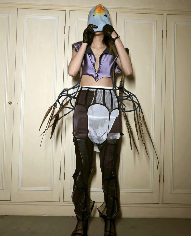 In a lineup, Zita Tianyu Tan’s designs look like pieces plucked from Christian Grey’s closet. Her curation of sheer fabric, feathers, boning, and stockings serves sex with a side of sadness. In her 2021 womenswear collection titled, Texture of Emotions, Tan aestheticizes pain by creating erotic ensembles from burnt or broken materials. She manipulates feathers with a heat gun, for example, to achieve the proper shape she needs for her designs. The process of melting and molding the feathers encapsulates pain. The feathers, themselves, articulate agony, for they once belonged to a bird’s body until someone or something ripped them away. Tan tacks the feathers onto her garments or makes them the boning of her corsets to create a titillating piece of pain.