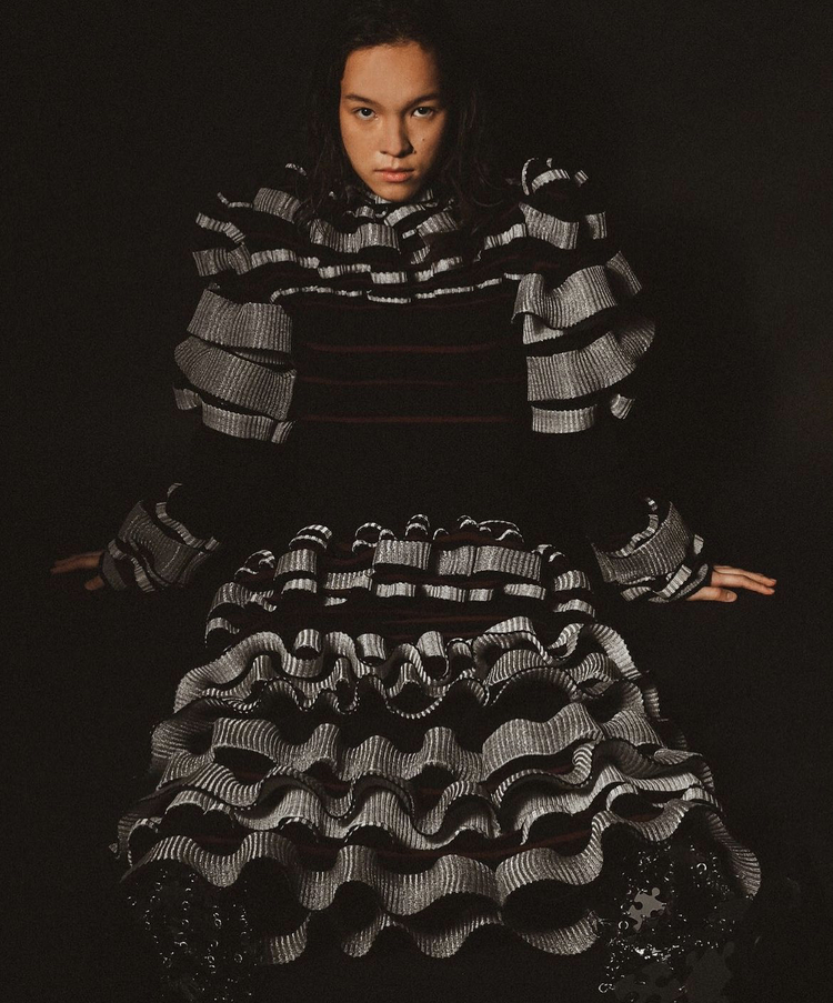 Chaewon Song is a knitwear major at Institut Francais de la Mode in Paris, France. With names like “Ellipsoid '' and “Conoid Surface'', Song's work takes a mathematical approach to dress. By playing with perception in her work, Chaewon Song creates fabric embodiments of geometric wonders.