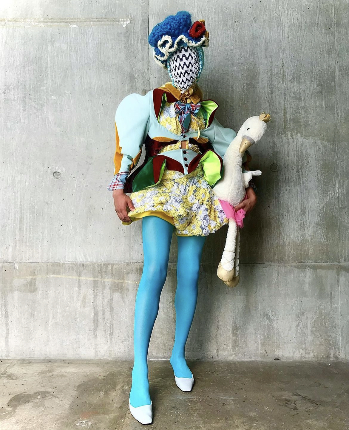 Standing out against his portfolio of colorful designs is De La Cruz’s 2021 CSM white show look. A white puffy mini dress, with elegantly enormous white sleeves. The bodice is a quilted pattern, flowing into a deconstructed skirt. The model dons a purple face mask with protruding devil horns and a black bonnet. It looks straight out of a picture book with the crisp detail of the face mask and the whimsical shape of the dress.